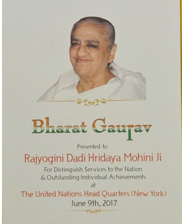 ब्रह्मा कुमारीज़ संस्था की अतिरिक्त मुख्य प्रशासिका दादी ह्रदय मोहिनी जी को राष्ट्र के लिए उनकी प्रतिष्ठित सेवाओं और उत्कृष्ट व्यक्तित्व की उपलब्धि के लिए “भारत गौरव पुरस्कार” 9 जून, 2017 को संयुक्त राष्ट्र संघ द्वारा न्यूयॉर्क में प्रदान किया गया। इस समारोह में विश्व भर से पधारे गणमान्य व्यक्ति उपस्थित थे।